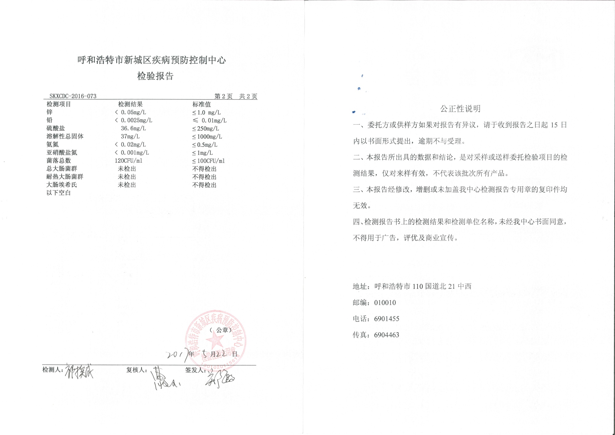 公示呼市新城區(qū)疾控中心對(duì)我校飲用水(過(guò)濾后)檢測(cè)報(bào)告